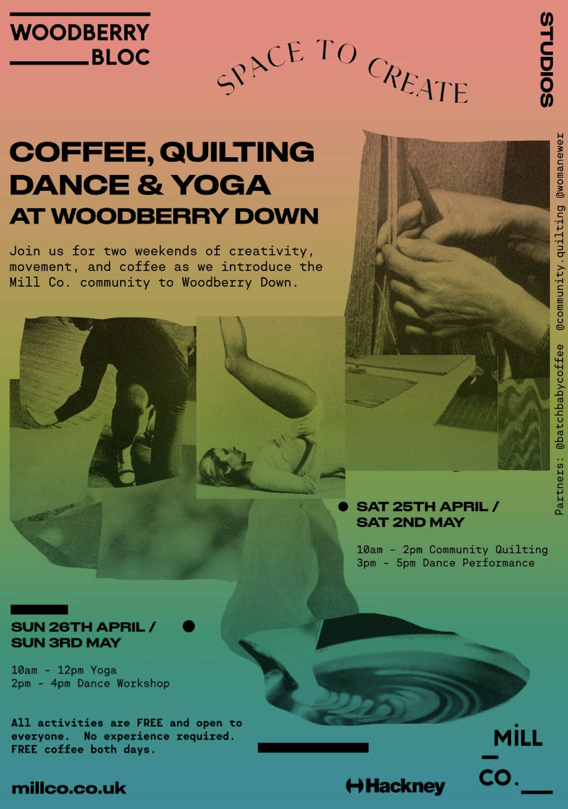 We are thrilled to announce two weekends full of FREE activities spanning movement, crafts, coffee and wellbeing. Join Community Quilting, Batch Baby and WomanEwer as we introduce the Mill Co. community to Woodberry Down