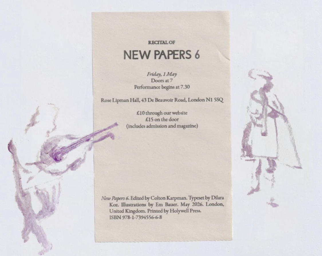 New Papers 5 will be released and performed in its entirety on 31 January 2026 at the Rose Lipman Building, which is the one-year anniversary of the release of the first issue of New Papers. Details will be announced in due course, but we ask now that you please save the date.
